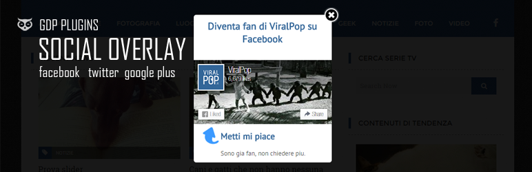 The plugin show modal css overlay with Facebook Page Plugin, Twitter widget or Google Plus Badge